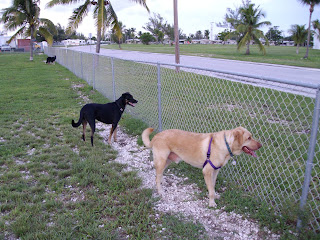 Daniel is another park regular. he is a cross-breed and a very good friend of Sasha, the Rat Terrier. In the picture below right to left is Hooter, Daniel and that black spot way down there is Auntie Essex. You can see the path she has worn down from almost four years of fence patrol. She is waiting for the next evil golf cart to pass by. I hear Dad coming so I have to go.